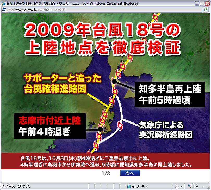 台風18号は、同庁の発表では8日午前5時頃、愛知県の知多半島に上陸したことになっているが、ウェザー社はこれに先立つ同4時頃、三重県の志摩半島に上陸したとする情報をホームページに掲載している。