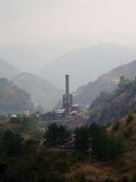 細い集落の道を進むと、V字の谷間の対岸の高台に錆び付いた鉄骨の枠組みと、同じく赤錆色に煤けた巨大な煙突が印象的な旧製錬所の建物が遺されていました。まるで映画のセットを見ているような非現実的な光景。。