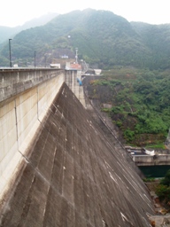 草木ダムの形式は越流型重力式コンクリートダム。堰高は140mと結構高め。もとともここはちょっとした断崖だったのかもしれない。その代わりにダムの堰堤が巨大な楔として打ち込まれたような印象。