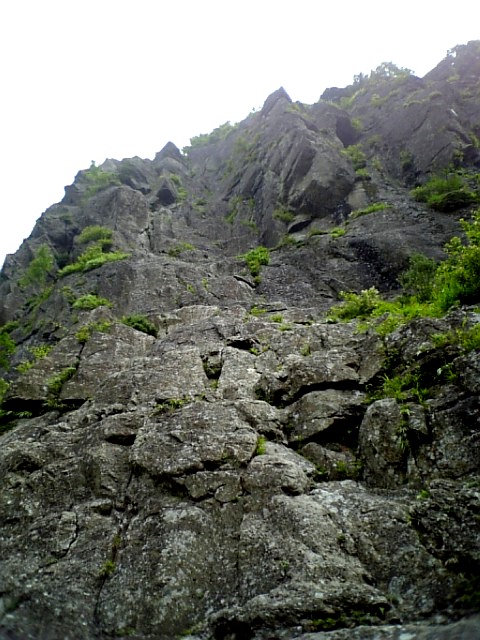 と、上のどこにも支点が見当たりません。どっちにいったらいいんだろーと思いつつ、楽なほうへと左に流れたら、岩が腐っております。苔がついているし岩が脆いし。ひえぇぇ。