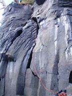 流血沙汰にめげずに続けて「晦日(5.8)」にトライ。中間部でちょっとしたハングの乗越があり、前回城ヶ崎のファミリークラックにある同グレードのルートでランディングに苦心したので、内心ちょっと怯みつつも、降りてきたY氏が「見た目より辛くない。面白い」というので、挑戦。なるほど、中間部のハングはハンドジャムがばっちり決まり、乗り越す際にもフットホールドがしっかりあるので、自分のようなヘタレにも安心。楽しい。