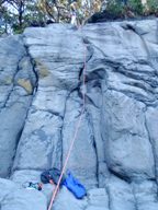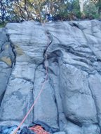 5.8にしてはこの日の中で一番易しいルート。でも終了点がない。懸垂下降するにも適した支点が見当たらない(離れたところまで歩けばあった)。少し離れたところに頑丈そうな木があったので、そちらにロープを回して懸垂下降をしたら思いっきり振られてしまった。危ない。良い子は決して真似しないでください。
