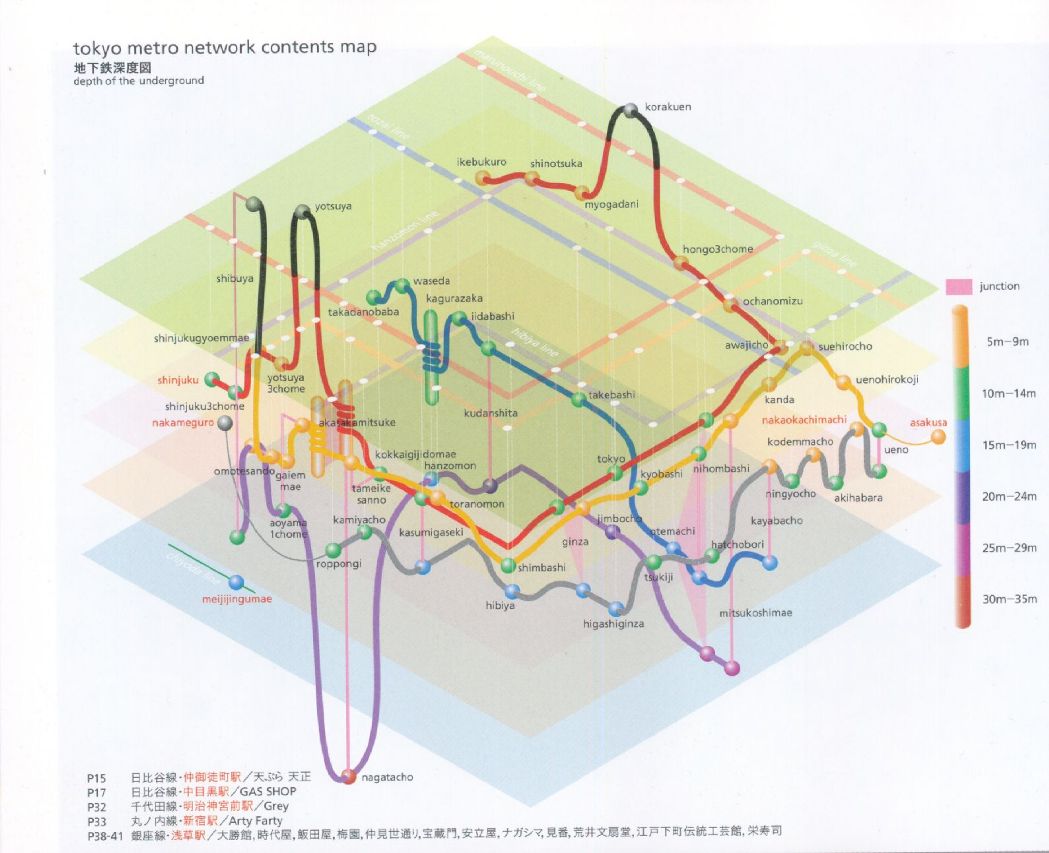 ただ、このマップだと地表からの深度が示されているので、ほんとうは、たとえば渋谷駅では銀座線がうにょ~んと上昇するのではなくて、地表の海抜が下がるんだろうなと思われ。