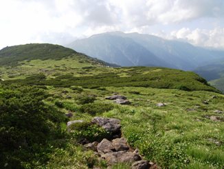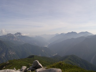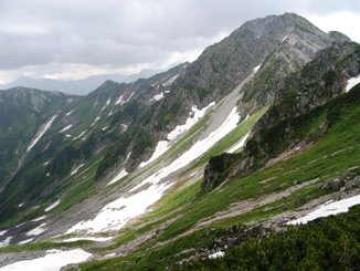 ←はるか前方に水晶岳。「水晶が採れる」ということなので、かなりwktkだったのですが、どうも玄武岩っぽい岩塊で内心がっかりしたのは内緒です(国立公園内での鉱物の採取は事前の申請が必要です。はい)。