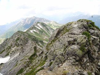 赤牛岳から水晶岳までは2時間40分の行程。緩いアップダウンの稜線の道で、思う存分絶景を満喫。ただ、この手の道は、思うほどには足がはかどらない。