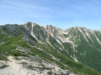 「温泉いいな~」と誘惑にかられつつ、水晶岳に向かう。ここからアップダウンが顕著になり、土のトラバース道とゴツゴツした岩が露出する道が交互に現れる。赤牛岳に比べたら浮石は格段に少ないけれど、しんどいのはどっちもどっち。