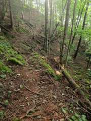 13時20分に遡行終了。踏み跡を辿ってトラバース気味に斜面を上がると、苔生した石が石畳状に上に続いている。石畳を忠実に直登し、目の前に笹藪が現れたところで右にトラバースする踏み跡を辿る。獣道にしてはフンがないので人が歩いた道だと思われる。少し歩くと、ガレ場に至る。ここで踏み跡が途絶える。水のチョロチョロ流れるガレ場を登り、傾斜が厳しくなったところで右手に再び踏み跡を見つける。