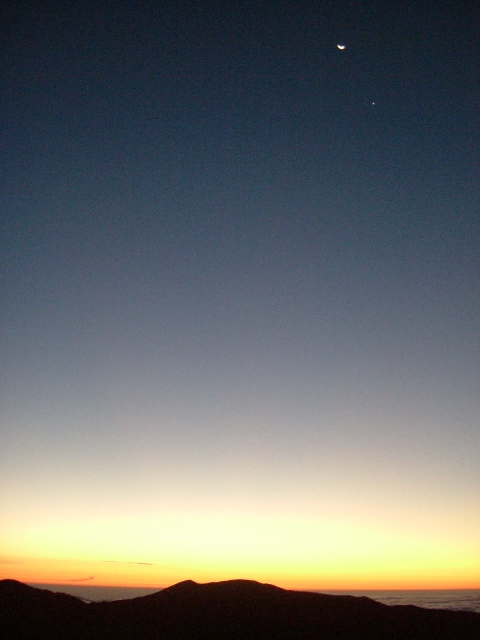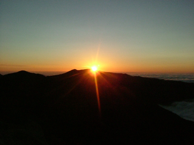 山頂の岩塊をよじのぼって東の空を見ると、群青色の空の高みに小さく架かる星と明けの明星、低いところはオレンジ色の朝未来。高層には雲ひとつなく、眼下には一面の雲海。