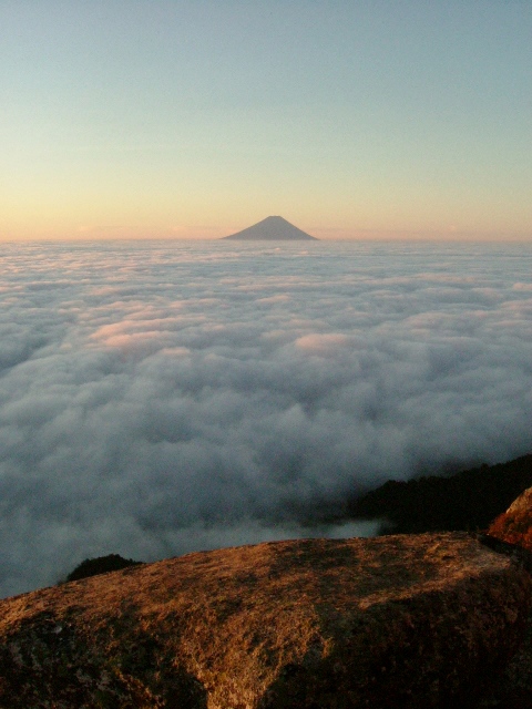 東南の方角を見やると雲海の波頭の向こうに富士山の雄姿が鮮明。東の海にあるという蓬莱山とはこれのことでしょうか、という気分。