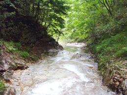 左沢にかかる見事なナメ滝を見送るあたりから、傾斜の緩い黒いナメの小滝が連続し出す。難しいところはとくになく直登できるか、主に左岸に明瞭な巻き道あり。