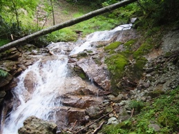 3段ナメ滝最上部の10mくらいの滝は左のガレから水流を右に入り直登。続く8mくらいの滝はさすがに傾斜が強くて水流右のガレルンゼから落ち口経由で越える。