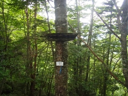 コルに下りるとそこは四郎峠という旧道の峠道だそうで、丸沼高原に至る登山道を示す道標やテープがたくさんありました。