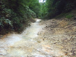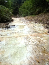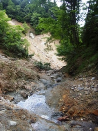 平坦な林道を30分ほど鬼怒沼方面へぽくぽく歩き、物見橋を渡ると入渓点となる広い広場。ここは湯沢と根羽沢の出合。広場の先にはかつての鉱山跡を偲ばせるズリ山がどでんと積み上げられていました。根羽沢鉱山の主要産出物は金と銀。金と銀! (な、なんだってーw