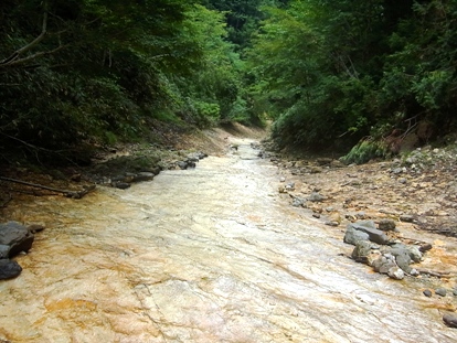 懸案だった6m滝もロープを出さずに降りることができ、今一度鉱山の軌道跡を右手に見たら、朝入渓した広場に到着。