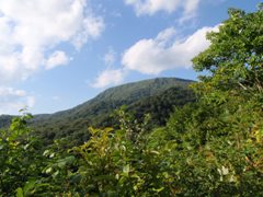 下山途中に振り返ったところ。アスピーテ火山の台地はどこまでもなだらか。ブナやオオシラビソ、チシマザサの原生林。山の上に草原と湿原が広がる。