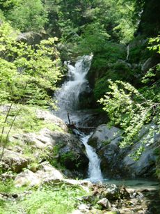 左岸支流の堰堤工事現場を横目にガレ場を登り続けて行くと、周囲は一転して深い緑の渓谷。