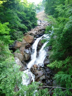 そこだけ切り開いたかのような広い空間の先に、白い一条の水流がすーっと落ちていました。