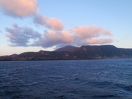 朝6時に大島の岡田港に着岸。下船完了を待つうちに、島影の向こう側の空に曙光の兆し。岡田港を離れて船が再び走り出す頃には空がすっかり白み、東の洋上からご来光。波浮の港を右手に見送ると、大島の島影を出たためにうねりが強くなる。おえっぷ。