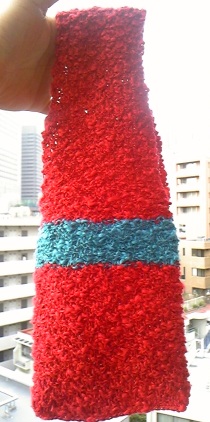 サマースラブの赤色がかわいいので赤一色でいいかとも思ったものの、真っ赤なぽこぽこスラブ糸! というほっこり感に早々とお腹いっぱいになってしまい、途中でトルコブルーを入れて強そうにしたら、携帯ホルダーと同じ色あわせになってしまいました。。