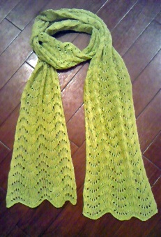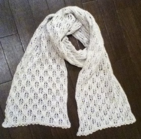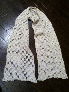 パターンは棒針の基礎本にあった透かし模様。すごくシンプルでどこで手を止めてもすぐに再開できる点はすばらしいけれど、あまりに単調なので連続して編んでいると大メリヤス砂漠を横断するみたいにトランスしそうだった。。