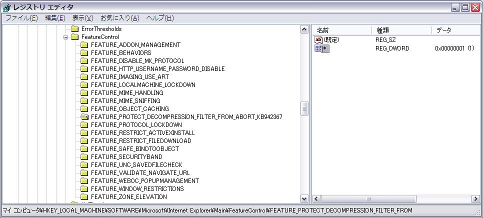 修正パッチKB946627をインストールした後でレジストリエディタを開いてみたら、この技術情報に説明されている「回避策」のとおりになっていました。ふーむ。自分にはよくわかりませんが。。