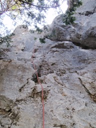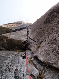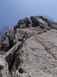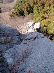 2P(IV、5.8): 自分がリード。すぐ真上にピカピカ光るハンガーボルトが見え、カンテを絡んで左から直上。またすぐ2つ目のハンガー。カンテを絡んで右の凹角に移って終了点に到着。核心の3P目を見上げつつ、支点の準備。下を覗きこむとすぐ真下に小テラスが見える。実質15mくらい。