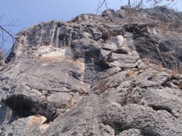 1P(III、5.7): Yさんリード。今回カムを一式持参して臨んだものの、しっかりした残置ピトンが各所にありカムを用いることなくするするっとフェースを直上し、凹角のフレークを乗り越して右の小テラスに移ってビレイ。凹角に移る手前と終了点はハンガーボルト。