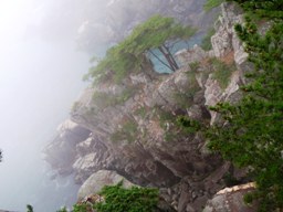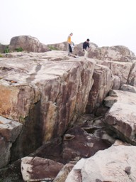 車で浜辺近くに移動して林の中を3分ほど歩くと展望台に到着。岩場はここの真下。「やませ」が吹き寄せていて霧が濃い。幻想的だけれど、残念ながら視界が悪い。