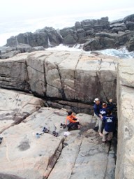 出発時、都内は雨がしのついていて、福島県を通過するときにはかなりの豪雨。久慈に着いた時分は幸いにも曇り。ただ、大きな雨雲が日本列島を東北に進路をとっているという予報だったので、どの時点で雨に捕まるかが問題―というわけで、早々と岩場に移動。