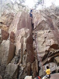 まずはアップで「Adam's Apple(5.10a)」に取り付く(上の写真)。トップのYさんは難なくオンサイト。続けて自分もトライ。下部は長くて快適、上部の核心ではやや気合が必要で、しばらくモタモタしたもののなんとかFL。