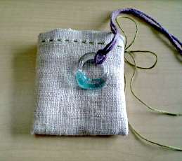 ガラスの指輪を入れる小袋をちくちく縫う。ガタガタのヒドイ手縫い。
