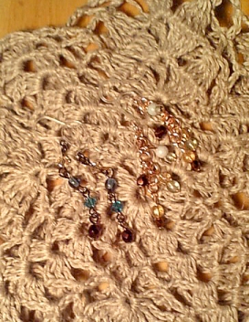 ビーズを丸カンや9ピンで繋いで、メッキは負けてしまうので樹脂のピアスフックに取り付けただけのちゃっちいシロモノだけど、なんかできました。わーい。