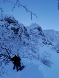肩で息をしながらY氏に合流。ぜーはぜーは。「じゃあ、つるべで行く?」とY氏に問われ、ちょ、ちょっと待ったと息を整える時間をもらう。ぜーはぜーは。「出てすぐの木でランナー取るといいよ」とY氏。了解だす。というわけで、左の草付き帯へ踏み出す。ふわ雪の下は腐れ雪で、いまいち心許ない。点在する潅木にしがみつくようにして雪壁を登る。できるだけロープを伸ばし、少し傾斜が緩くなったところで支点をセット。
