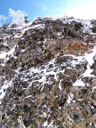 10時20分に上部岩壁下部に到着。喉がカラカラなので小休止。陽射しが強く暖かく、表層の雪はみるみる焼結し、てらてらと光る。雪と氷と過冷却水と水と、小さな熱平衡のダイナミックなゆらぎ。