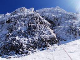 雪稜なのでどうぞと言われ、自分がリード。先ほどと同じく尾根の左側の草付き帯を登る。下部よりは雪が締まっていて少しほっとする。途中の潅木でランニングビレイをとりながらできるだけロープを伸ばす。ふと見上げると尾根の右手に陽射しが当たり明るい。あぁあそこまで行こうと、さらにロープを伸ばす。潅木にビレイ点をセット。上部岩壁の取り付き点が目前に見える。