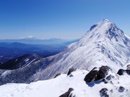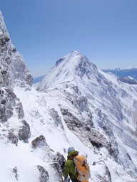 その先の雪稜はコンテで慎重に歩く。垂れたロープが時々足元にまとわりつく。少し傾斜が強くなったところで再度ロープを出すことにする。冷えた指先に温かい血が戻り、指先の深部が鈍く傷む。