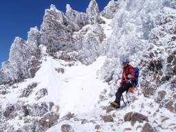 「登ってきていいよー」とコールを受けて、自分も登り始める。右に回りこむところの足元がいまいち悪い。いったん引き返してここかいなと取り付くと、頭上のY氏から「もっと右から」とのアドバイス。左壁をアンダーで抑えて回り込むと、あぁなるほどここか、というルンゼ。傾斜は緩やかだけど、中間部が少しいやらしい。薄く草の付いた凹みにピッケルを刺しても、雪の状態が悪くてちっとも決まらない。岩に氷が張り付いていてつるっとした感触にヒヤり。上部も良い手がないものの、足場は割と良くハイステップで抜ける。あぁ、自分がリードだったら抜けられなかったかもな。。