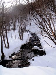 別荘地前の舗装道路にはうっすらと雪が残っているので山スキー組は最初から板を履いてスタート。15分ほど歩くとアスファルトの道が終わり、林道に続く。左手にヤカイ沢の流れを見る。