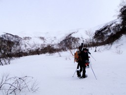 次第に木々が煩くなる中、雪に覆われたヤカイ沢の窪みを越えて、さらに樹林帯を下る。徐々に周辺にスキーの滑走跡が増え、Fさんの的確なルーファイのお陰で登ったときの道筋の側に至る。