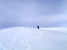 休憩を終え山スキー隊もスキーを外してみなでツボツボと再び歩き出し。Fさんが猛烈なキックステップで雪の斜面に階段をつくって進む。スノーシュー隊2名と自分(わかん)は階段脇を登るものの、結局ツボ足になり階段を登る。快適。ありがとうございます。