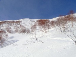 まだこのあたりは疎林で、振り返るとまばらな木立の向こうに滑ってきた斜面が見える。下から見上げる斜面はそれほど傾斜を感じさせず、上から見下ろしたときの印象と全然違う。
