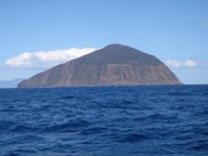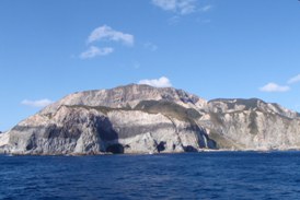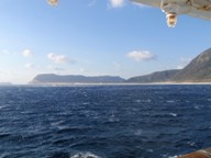 船室でもう一度寝こけていたら、朝8時20分過ぎに右手の船窓に島影が。あれ、右舷に島影? と、慌ててデッキに出てみると、どうやら新島のメインポートである黒根浜(前浜港)ではなく、羽伏浦港に接岸する模様。