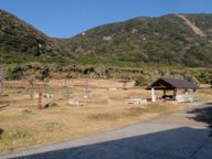 「そこで受付してね」とドライバーさんに言われた建物に向かうものの、入口は施錠され中は無人。ま、朝早いからまだ人が来ないんだろね、と、テントサイトに向かう。宮塚山に連なる丘陵の麓にあり、羽伏浦海岸まで徒歩10分というロケーションの良さもさることながら、ここのキャンプ場はとてもきれいに整備されていて、トイレやシャワー(水のみ。海の潮を落とすため)、炊事棟にBBQ用のコンロ、分別ゴミ箱などが完備。でもタダ。すごい。ちょっと住民税のモトがとれたような気がする(深い意味はありません)。