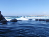 ←手前が温泉、真ん中が海、その上が空。寄せては返す波のリズムが心地良くて、ぼけ~っとするのに最適。