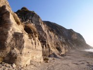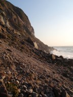 昼寝から目が覚めてもまだ陽が高かったので、ひとりで間々下浦海岸をお散歩。今日はサーファーさんたちの姿がない。海岸沿いにはまたしても自分ひとり。砂浜の先にある岩場を歩く。レンガ色をした割合大きめの石がいくつかゴロゴロ転がっている。SiO2の含有率が高いらしくガラス質。つるりと滑らかで硬そう。上を見ると白い堆積岩層の上にレンガ色の大きな岩が露頭している。あそこから落ちてきたんだろうな。どうか今ここで落ちてきませんように。。