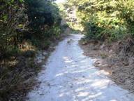 1つ目はアウト。アスファルト舗装が終わり、車の轍の残る砂道をへろへろとママチャリで進んだら、次第に道幅が狭くなり、山道程度の幅になるところに烏骨鶏の群れ。ええ、なんでこんなところに烏骨鶏?? 新島おそるべし。(近くの農園で放し飼いにされているそうです)