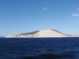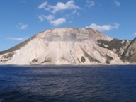 海が荒れているからか、表玄関である神津島港ではなく多幸湾に入港。天上山の真っ白い山肌が目前に迫る。2000年に起きた地震で南西面の山腹が崩壊したそうでいよいよ白い。