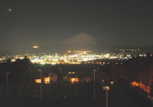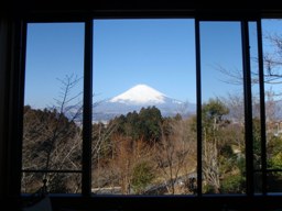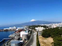 雄大な裾野に連なる富士山の峰がお見事。雲ひとつない快晴だけれど、上空の風は昨日よりも強いらしく、山頂付近は雪煙が舞っている。白い頂が連なる赤石山脈も見える。