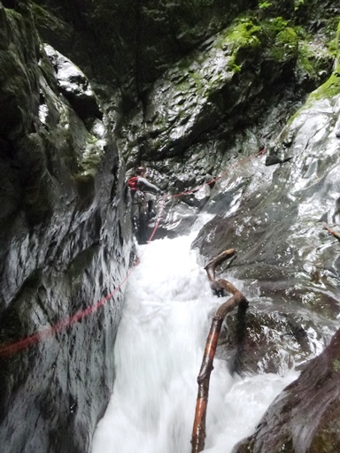 側壁が一段と高くそびえたところに5m滝が登場。突破できないかと近寄って見学してみたものの抜け口で水流に押し出されそうだったので、定石通り右岸高巻きからの20m空中懸垂で沢へ。